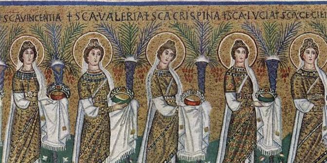 Sainte Lucie est également représentée parmi les mosaïques de la basilique Saint-Apollinaire-le-Neuf à Ravenne . Lucie figure parmi les vierges martyres de la mosaïque de la procession des vierges (la deuxième en partant de la droite), qui fait face à la mosaïque de la procession des martyrs, au registre inférieur dans la nef. Cette série de mosaïques date de l’époque byzantine de Ravenne, à partir de 540. On reconnaît en effet dans l’art de la composition la répétition des attitudes, les motifs végétaux utilisés de manière purement décorative sans chercher à créer du volume, les personnages placés sans soutien dans le plan comme flottant dans l’espace, les figures toujours vues de face et au regard fixe, l’habillement précieux et l’usage du fond d’or, propres à l’art byzantin.