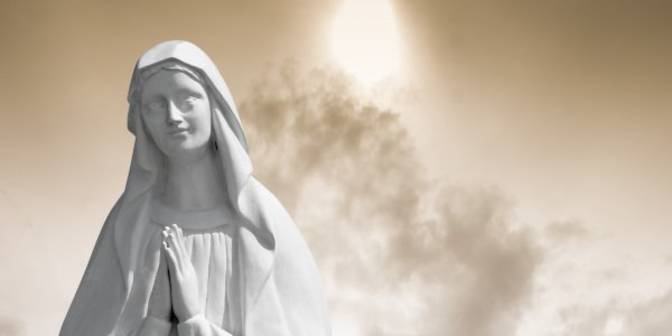 La voilà qui arrive, de loin, telle une boule lumineuse, éblouissante, qui, avant de traverser la balustrade de la terrasse, se matérialise en une jeune femme « si belle », dira Myrna, en extase ! C’est la Vierge, elle est devant elle, en suspension, légèrement au-dessus de Myrna qui est tombée à genoux, prête et toute donnée.