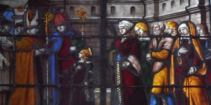 Septembre 429 : en route pour la Grande-Bretagne, les évêques d’Auxerre, Germain, et de Troyes, Loup , font halte à Nanterre. Severus, le principal notable de la ville, ancien officier de cavalerie d’origine franque, son épouse et leur fille unique Geneviève, âgée de sept ans, sont présents pour les accueillir. En voyant l’enfant, Germain s’écrie : « Heureux parents dont l’enfant sera tenue en vénération. Sachez qu’il y eut grande fête au Ciel à sa naissance ! » Puis il demande à la fillette si elle veut consacrer sa virginité à Dieu. Geneviève répond que c’est son vœu le plus cher. Le lendemain, il lui impose les mains, puis lui donne ce conseil étonnant : « Va, ma fille, et conduis-toi en homme ! »