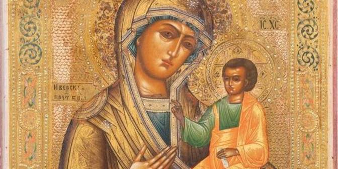 À l’instar d’autres saintes images orthodoxes, l’Iverskaya est porteuse d’une tradition et d’un glorieux passé qui lui valent une vénération spéciale. Installée à Moscou en octobre 1648 par le tsar Alexis, il s’agit de la copie d’une icône vénérée sur le mont Athos, en Grèce, au monastère d’Iveron, forme grecque d’Ibérie, ancien nom désignant l’est de la Géorgie. Iverskaya veut donc dire « la Géorgienne » ou « Notre Dame de Géorgie ». Certains pensent qu’elle aurait échappé à l’occupation de Tbilissi par les Perses pour être mise à l’abri sur l’Athos, mais la sainteté de l’image se fonde sur une autre histoire. Comme plusieurs autres portraits dans le monde chrétien, la Tradition attribue celui de Marie tenant l’Enfant Jésus à l’évangéliste Luc, qui l’aurait peint tandis qu’il recueillait les souvenirs de la Vierge à Éphèse. Vénérée à Constantinople, l’icône a été mutilée au IXe siècle, lors de la grande crise orientale de l’iconoclasme qui voulait détruire les saintes images pour interdire leur vénération. L’on voit distinctement sur la joue droite de Marie, près de son menton, la cicatrice laissée par l’arme blanche qui frappa l’icône. On affirme que la blessure se mit à saigner ; le profanateur, bouleversé et repentant, sauva l’icône au lieu de la détruire et la confia à sa mère, afin qu’elle la cache. La persécution s’aggravant, la famille qui l’hébergeait se résolut, la mort dans l’âme, à la confier à la mer, près de Nicée, afin qu’elle vogue vers des rivages plus cléments.