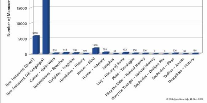 Pour bien faire comprendre cette différence radicale d’attestation historique, les historiens proposent l’analogie suivante : « Si l’on suppose que le manuscrit moyen fait cinq centimètres d’épaisseur, et si l’on entassait toutes les copies de l’œuvre d’un auteur grec de l’Antiquité, cette pile ferait en moyenne 1,2 mètre, alors que les copies du Nouveau Testament s’élèveraient à 1,6 kilomètre ! Voici ce qu’on appelle un embarras de richesses » (J. Ed. Komoszewski, M. J. Sawyer, D. B. Wallace, Reinventing Jesus: How Contemporary Skeptics Miss the Real Jesus and Mislead Popular Culture, Kregel Publications, 2006).