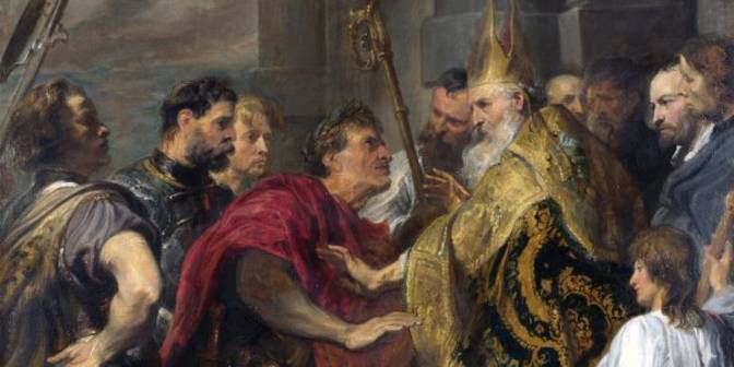 Ambroise exige aussi de Théodose, qui est devenu empereur en 379, de se soumettre à la pénitence publique à la suite du massacre de Thessalonique. En effet, la foule avait tué un général romain et Théodose avait alors ordonné des représailles qui firent plus de sept cents morts. L’empereur s’exécute, impressionné par l’audace et la fermeté d’Ambroise. « Je mets Dieu au-dessus de tout », lui écrit Ambroise pour expliquer sa conduite (Lettre 1, 17).