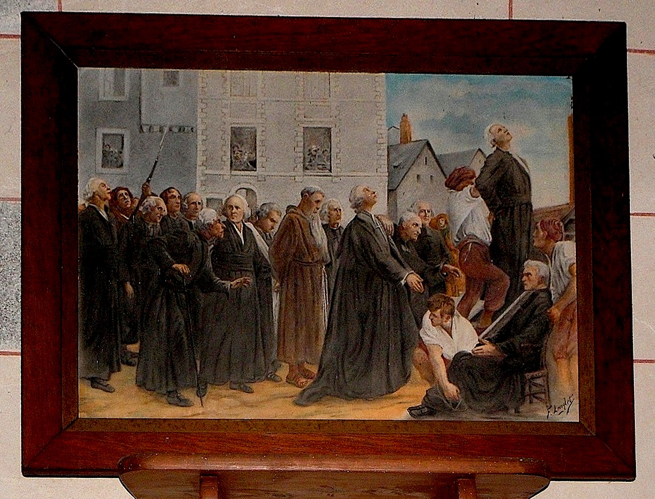 Les martyrs de Laval sont quatorze prêtres catholiques exécutés le 21 janvier 1794, en pleine Révolution française. Depuis 1791, les autorités révolutionnaires imposent au clergé le serment constitutionnel, qui soumet l’Église au pouvoir politique : évêques et curés deviennent des fonctionnaires élus par des citoyens, sans considération de leur foi, et ne dépendent plus du pape. Fidèles à Rome et à leur conscience, ces prêtres refusent le serment. Arrêtés comme « réfractaires », emprisonnés puis jugés sommairement, ils sont guillotinés à Laval. Leur mort n’est pas un acte politique, mais un témoignage de foi. Ils sont béatifiés en 1955 comme martyrs.