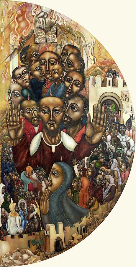À Jérusalem, la communauté primitive, sur la recommandation du Ressuscité, se réunit à la Pentecôte pour accueillir la venue de l’Esprit Saint, don de la nouvelle Alliance (Actes 1-2 et ss).