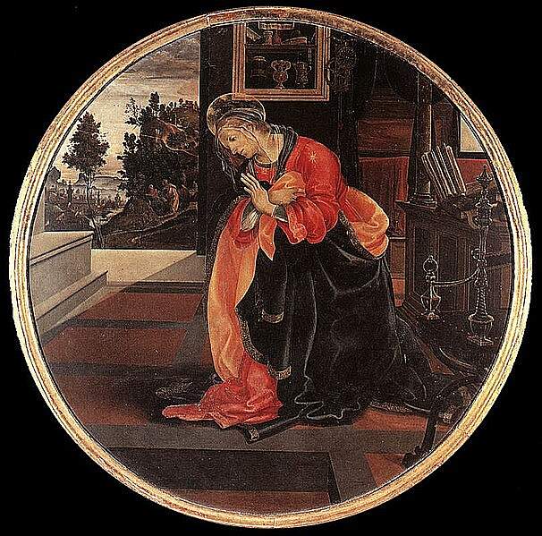 Filippino Lippi. L’ange de l’Annonciation, v.1483. tondo. Filippino Lippi, Public domain, via Wikimedia Commons.
