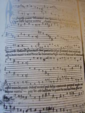 L’art vocal médiéval est passé peu à peu du stade monodique au stade polyphonique : on passe ainsi de l’ars antiqua à l’ars nova, nouvelle façon de composer la musique en combinant ensemble des lignes musicales tant du point de vue du rythme que des intervalles, au sein de l’école de Notre Dame[5], développée par les deux compositeurs Léonin et Pérotin. Au XIVes, le poète et compositeur Guillaume de Machaut nous offre la Messe de Nostre-Dame ♪, messe polyphonique à quatre voix, caractéristique de cet Ars nova.