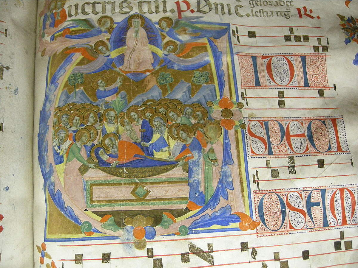 D’autre part, dès le XIes naissent de nombreuses nouvelles séquences et pièces liturgiques célébrant la Vierge Marie : Le Salve Regina[6] en est un exemple. Cette antienne célèbre la Vierge Marie comme Reine, mais également comme Mère de miséricorde. Dans la seconde moitié du XIIe s. la Vierge Marie commence à être vénérée sous le vocable de Notre-Dame, sous l’influence de l’esprit courtois, et au XIIIe s. apparaissent de nouvelles séquences : Ave gloriosa virginum Regina, et le Stabat Mater[7], fruit d’une dévotion à Notre-Dame des Douleurs, œuvre du franciscain Jacopone da Todi. C’est également au XIIIe s. que naissent une littérature narrative et des pièces paraliturgiques telles que les Miracles de Notre Dame de Gauthier de Coincy, et que se développe le ‘motet’. Petite composition musicale à une ou plusieurs voix, le motet comporte ou non un accompagnement instrumental. Les motets polyphoniques vont s’appuyer sur des pièces de musique religieuse, composées sur des textes latins ne concernant pas l’office - antienne, hymne, offertoire, psaume, répons. Ils vont également mettre en musique des prières : Josquin-des-prés, par exemple, l’un des grands représentants de l’école franco-flamande à la Renaissance, va composer de nombreux motets pour célébrer la Vierge Marie ♪, ainsi que deux messes ♪ qui lui sont dédiées. Le motet va connaître un immense essor à partir de la Renaissance, âge d’or de la polyphonie sacrée.