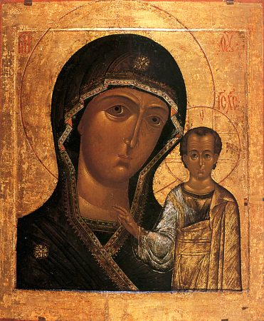 Selon les experts, l’icône de la Vierge à l’enfant remonte au XIIIe siècle. Elle est du type « hodigitria », celle qui montre Jésus, le chemin. Elle aurait été peinte à Constantinople et placée dans un monastère de Kazan d’où elle disparaît en 1209, pendant l’invasion des Tartares. Quand Ivan le Terrible fait la reconquête de cette région, toute la ville de Kazan est incendiée (1552).