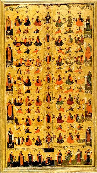 En haut de l'arbre, Marie, le Christ et l'Esprit Saint (qu'ils soient l'un au-dessus de l'autre où que l'on ait peint une Vierge à l'enfant) représentent la génération virginale, spirituelle, par le lien de la charité.