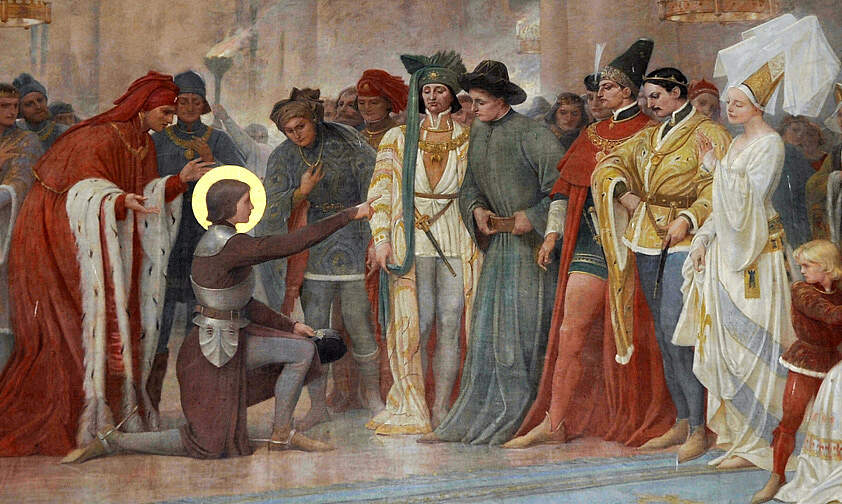 Notre vit la prière sous la forme d’un dialogue permanent avec le Seigneur, qui illumine également son dialogue avec les juges et lui apporte la paix et la sécurité. Elle demande avec confiance : « Très doux Dieu, en l’honneur de votre Passion, je vous requiers, si vous m’aimez, que vous me révélez comment je dois répondre à ces gens d’Eglise »[8]. Jésus est contemplé par Jeanne comme le « Roi du Ciel et de la Terre ». Ainsi, sur son étendard, Jeanne fait peindre l’image de « Notre Seigneur tenant le monde »[9] : icône de sa mission politique.