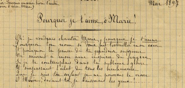 Dans son poème Pourquoi je t'aime, ô Marie" (PN 54), sainte Thérèse de l’Enfant Jésus exalte à la fois l'amour de Marie et l’amour que Thérèse lui port...