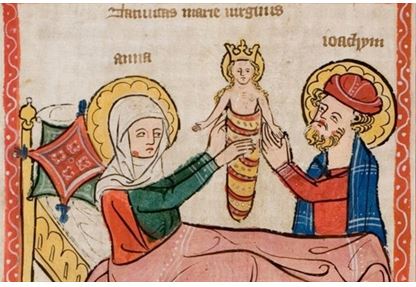 L’Écriture ne dit rien de la naissance de la Vierge Marie. Ce sont les récits apocryphes qui relatent l’événement, dont le Protévangile de Jacques, datant du IIès.