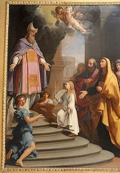 « L'enfant atteignit l'âge de trois ans et Joachim dit : "Appelez les vierges sans tache des Hébreux et qu'elles prennent des lampes et qu'elles les allument et que l'enfant ne se retourne pas en arrière et que son esprit ne s'éloigne pas de la maison de Dieu." Et les vierges agirent ainsi et elles entrèrent dans le temple. Et le prince des prêtres reçut l'enfant et il l'embrassa et il dit : "Marie, le Seigneur a donné de la grandeur à ton nom dans toutes les générations, et, à la fin des jours, le Seigneur manifestera en toi le prix de la rédemption des fils d'Israël." Et il la plaça sur le troisième degré de l'autel, et le Seigneur Dieu répandit sa grâce sur elle et elle tressaillit de joie en dansant avec ses pieds et toute la maison d'Israël la chérit. » (Protévangile de Jacques, chapitre VII)