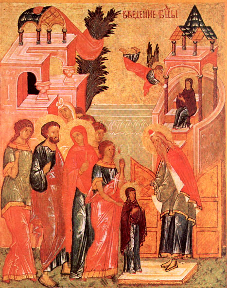 La liturgie byzantine du 21 novembre, qui précède de nombreux siècles la liturgie romaine, commente le récit apocryphe du Protévangile de Jacques. La liturgie byzantine met en relief les implications théologiques et spirituelles de ce très ancien récit (et c’est ce que retiendra l’Église latine) :