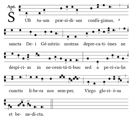 Parmi les plus anciens textes de dévotion à Marie, le « Sub Tuum praesidium » (« Sous l’abri de Ta miséricorde, nous nous réfugions ») est l’un des plus anciens textes de dévotion mariale : on le date du IIIe siècle.