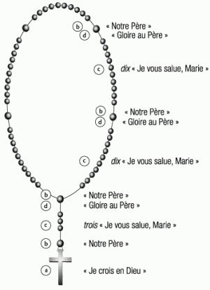 Une dizaine est formée avec un " Notre Père ", dix " Je vous salue Marie ", un " Gloire au Père ".