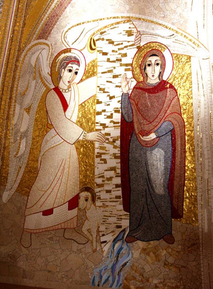 N.B. Sur l’illustration, nous voyons une Annonciation où le Christ est représenté comme un agneau : il vient pour prendre sur lui la violence que depuis le meurtre d’Abel les hommes se renvoient les uns aux autres. Le fleuve est - selon saint Ephrem - la parole de Dieu, à la fois source primordiale de tout le créé, et source (par l’Incarnation) de notre purification et de notre baptême.