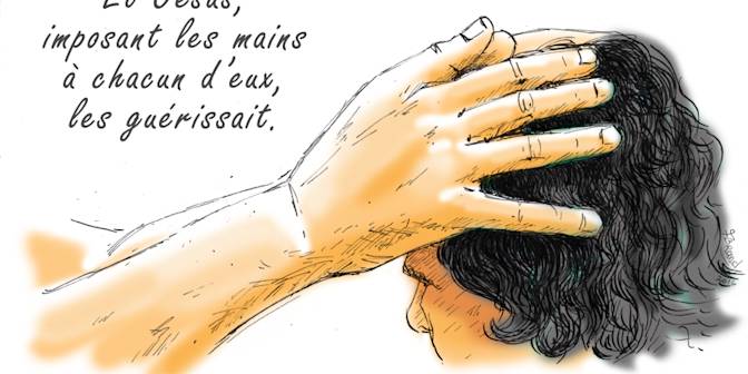 Jésus sourit encore. Il la prend par la main. La main rugueuse, aux veines gonflées disparaît dans la main juvénile de Jésus, qui se redresse et prend l’attitude qu’il a habituellement pour accomplir un miracle. Il crie :