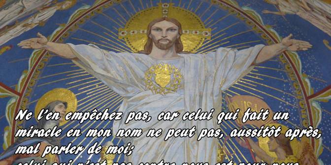 En ce temps-là, Jean, l’un des Douze, disait à Jésus : « Maître, nous avons vu quelqu’un expulser les démons en ton nom ; nous l’en avons empêché, car il n’est pas de ceux qui nous suivent. » Jésus répondit : « Ne l’en empêchez pas, car celui qui fait un miracle en mon nom ne peut pas, aussitôt après, mal parler de moi ; celui qui n’est pas contre nous est pour nous. »