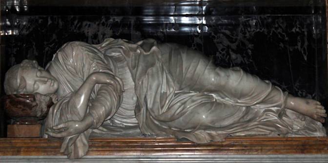 Une personne m’apparaît au centre exact de la rotonde. C’est un peu plus qu’une enfant. Elle doit avoir une douzaine d’années tout au plus, et son corps est moins développé que celui de sainte Agnès, dont elle diffère aussi parce qu’elle est plus petite, brune et que sa peau est d’un blanc qui tire sur le brun. Elle a deux grands yeux noirs fort doux, un peu tristes, un peu las, comme s’ils avaient beaucoup souffert ou comme s’ils appartenaient à quelqu’un qui a beaucoup souffert. Son sourire est doux, lui aussi un peu triste. Elle porte un vêtement tout blanc en lin, flou, sans ceintures, avec des manches jusqu’au coude dont il sort deux avant-bras bien tournés qui se terminent en deux petites mains brunes croisées sur la poitrine. Son visage est lumineux, mais sans plus. Ce n’est pas un visage rayonnant de bienheureuse. C’est une douce apparition, lumineuse cependant, d’une lumière d’étoile sous un léger voile de nuage. Mais elle m’attire, car c’est une lumière d’une suavité pure qui procure paix et joie. Le contraste avec les murailles sombres est des plus vifs. Elle me regarde et sourit.