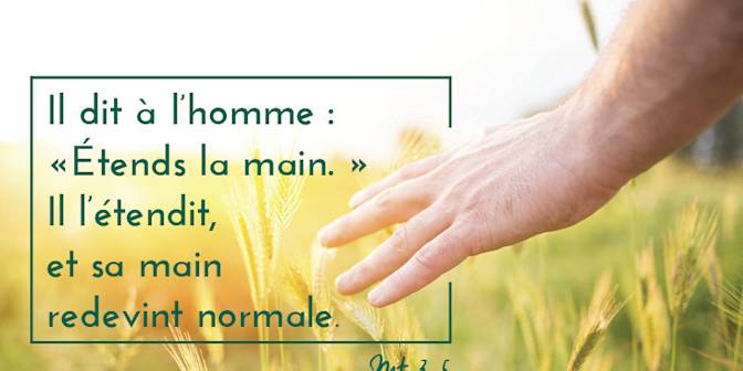 En ce temps- là, Jésus entra de nouveau dans une synagogue ; il y avait là un homme dont la main était atrophiée. On observait Jésus pour voir s’il le guérirait le jour du sabbat. C’était afin de pouvoir l’accuser. Il dit à l’homme qui avait la main atrophiée : « Lève-toi, viens au milieu. » Et s’adressant aux autres : « Est-il permis, le jour du sabbat, de faire le bien ou de faire le mal ? de sauver une vie ou de tuer ? » Mais eux se taisaient. Alors, promenant sur eux un regard de colère, navré de l’endurcissement de leurs cœurs, il dit à l’homme : « Étends la main. » Il l’étendit, et sa main redevint normale. Une fois sortis, les pharisiens se réunirent en conseil avec les partisans d’Hérode contre Jésus, pour voir comment le faire périr.