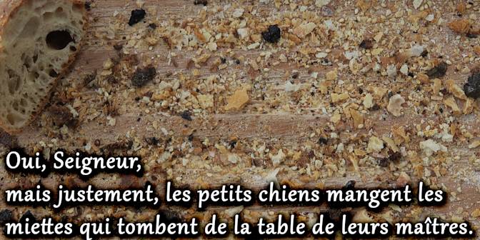 – Pourtant, les chiens entrent dans la pièce où le maître prend son repas avec ses enfants, et ils mangent ce qui tombe de la table, ou les restes que leur donnent les gens de maison, ce qui ne sert plus. Je ne te demande pas de me traiter comme une fille et de me faire asseoir à ta table. Mais donne-moi, au moins, les miettes… »