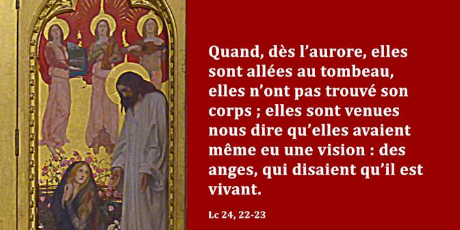 Le même jour (c’est-à-dire le premier jour de la semaine), deux disciples faisaient route vers un village appelé Emmaüs, à deux heures de marche de Jérusalem, et ils parlaient entre eux de tout ce qui s’était passé. Or, tandis qu’ils s’entretenaient et s’interrogeaient, Jésus lui-même s’approcha, et il marchait avec eux. Mais leurs yeux étaient empêchés de le reconnaître. Jésus leur dit : « De quoi discutez-vous en marchant ? » Alors, ils s’arrêtèrent, tout tristes. L’un des deux, nommé Cléophas, lui répondit : « Tu es bien le seul étranger résidant à Jérusalem qui ignore les événements de ces jours-ci. » Il leur dit : « Quels événements ? » Ils lui répondirent : « Ce qui est arrivé à Jésus de Nazareth, cet homme qui était un prophète puissant par ses actes et ses paroles devant Dieu et devant tout le peuple : comment les grands prêtres et nos chefs l’ont livré, ils l’ont fait condamner à mort et ils l’ont crucifié. Nous, nous espérions que c’était lui qui allait délivrer Israël. Mais avec tout cela, voici déjà le troisième jour qui passe depuis que c’est arrivé. À vrai dire, des femmes de notre groupe nous ont remplis de stupeur. Quand, dès l’aurore, elles sont allées au tombeau, elles n’ont pas trouvé son corps ; elles sont venues nous dire qu’elles avaient même eu une vision : des anges, qui disaient qu’il est vivant. Quelques-uns de nos compagnons sont allés au tombeau, et ils ont trouvé les choses comme les femmes l’avaient dit ; mais lui, ils ne l’ont pas vu. » Il leur dit alors : « Esprits sans intelligence ! Comme votre cœur est lent à croire tout ce que les prophètes ont dit ! Ne fallait-il pas que le Christ souffrît cela pour entrer dans sa gloire ? » Et, partant de Moïse et de tous les Prophètes, il leur interpréta, dans toute l’Écriture, ce qui le concernait. Quand ils approchèrent du village où ils se rendaient, Jésus fit semblant d’aller plus loin. Mais ils s’efforcèrent de le retenir : « Reste avec nous, car le soir approche et déjà le jour baisse. » Il entra donc pour rester avec eux. Quand il fut à table avec eux, ayant pris le pain, il prononça la bénédiction et, l’ayant rompu, il le leur donna. Alors leurs yeux s’ouvrirent, et ils le reconnurent, mais il disparut à leurs regards. Ils se dirent l’un à l’autre : « Notre cœur n’était-il pas brûlant en nous, tandis qu’il nous parlait sur la route et nous ouvrait les Écritures ? » À l’instant même, ils se levèrent et retournèrent à Jérusalem. Ils y trouvèrent réunis les onze Apôtres et leurs compagnons, qui leur dirent : « Le Seigneur est réellement ressuscité : il est apparu à Simon-Pierre. » À leur tour, ils racontaient ce qui s’était passé sur la route, et comment le Seigneur s’était fait reconnaître par eux à la fraction du pain.