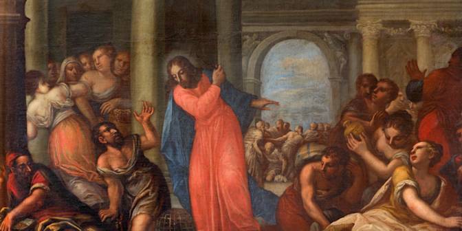 Comme la Pâque juive était proche, Jésus monta à Jérusalem. Dans le Temple, il trouva installés les marchands de bœufs, de brebis et de colombes, et les changeurs. Il fit un fouet avec des cordes, et les chassa tous du Temple, ainsi que les brebis et les bœufs ; il jeta par terre la monnaie des changeurs, renversa leurs comptoirs, et dit aux marchands de colombes : « Enlevez cela d’ici. Cessez de faire de la maison de mon Père une maison de commerce. » Ses disciples se rappelèrent qu’il est écrit : L’amour de ta maison fera mon tourment. Des Juifs l’interpellèrent : « Quel signe peux-tu nous donner pour agir ainsi ? » Jésus leur répondit : « Détruisez ce sanctuaire, et en trois jours je le relèverai. » Les Juifs lui répliquèrent : « Il a fallu quarante-six ans pour bâtir ce sanctuaire, et toi, en trois jours tu le relèverais ! » Mais lui parlait du sanctuaire de son corps. Aussi, quand il se réveilla d’entre les morts, ses disciples se rappelèrent qu’il avait dit cela ; ils crurent à l’Écriture et à la parole que Jésus avait dite.