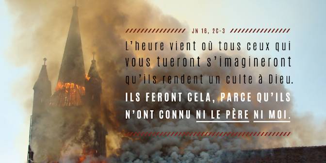 Je vous dis tout cela pour que, l’heure venue, vous ne succombiez pas et ne vous scandalisiez pas. Le temps va venir où on vous chassera des synagogues et où quiconque vous mettra à mort s’imaginera rendre un culte à Dieu. Ceux-là n’ont connu ni le Père ni moi. C’est là leur excuse. Je ne vous ai pas autant explicité ces vérités auparavant, parce que vous étiez comme des enfants nouveaux-nés. Mais maintenant, votre mère vous quitte. Je m’en vais. Vous devez vous accoutumer à une autre nourriture. Je veux que vous la connaissiez (…)