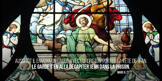 En ce temps-là, Hérode avait donné l’ordre d’arrêter Jean le Baptiste et de l’enchaîner dans la prison, à cause d’Hérodiade, la femme de son frère Philippe, que lui-même avait prise pour épouse. En effet, Jean lui disait : « Tu n’as pas le droit de prendre la femme de ton frère. » Hérodiade en voulait donc à Jean, et elle cherchait à le faire mourir. Mais elle n’y arrivait pas parce que Hérode avait peur de Jean : il savait que c’était un homme juste et saint, et il le protégeait ; quand il l’avait entendu, il était très embarrassé ; cependant il l’écoutait avec plaisir. Or, une occasion favorable se présenta quand, le jour de son anniversaire, Hérode fit un dîner pour ses dignitaires, pour les chefs de l’armée et pour les notables de la Galilée. La fille d’Hérodiade fit son entrée et dansa. Elle plut à Hérode et à ses convives. Le roi dit à la jeune fille : « Demande-moi ce que tu veux, et je te le donnerai. » Et il lui fit ce serment : « Tout ce que tu me demanderas, je te le donnerai, même si c’est la moitié de mon royaume. » Elle sortit alors pour dire à sa mère : « Qu’est-ce que je vais demander ? » Hérodiade répondit : « La tête de Jean, celui qui baptise. » Aussitôt la jeune fille s’empressa de retourner auprès du roi, et lui fit cette demande : « Je veux que, tout de suite, tu me donnes sur un plat la tête de Jean le Baptiste. » Le roi fut vivement contrarié; mais à cause du serment et des convives, il ne voulut pas lui opposer un refus. Aussitôt il envoya un garde avec l’ordre d’apporter la tête de Jean. Le garde s’en alla décapiter Jean dans la prison. Il apporta la tête sur un plat, la donna à la jeune fille, et la jeune fille la donna à sa mère. Ayant appris cela, les disciples de Jean vinrent prendre son corps et le déposèrent dans un tombeau.
