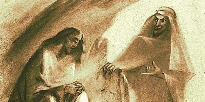Satan s’est assis en face de Jésus. Il le fouille de son regard terrible et sourit de sa bouche de serpent. Jésus se tait toujours et prie mentalement.