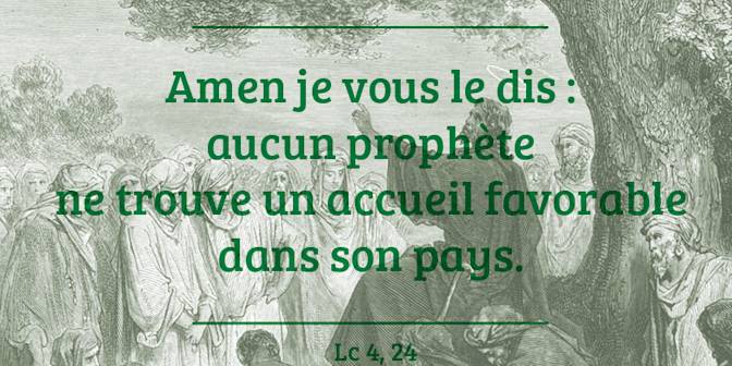 En ce temps-là, dans la synagogue de Nazareth, après la lecture du livre d’Isaïe, Jésus déclara : « Aujourd’hui s’accomplit ce passage de l’Écriture que vous venez d’entendre » Tous lui rendaient témoignage et s’étonnaient des paroles de grâce qui sortaient de sa bouche. Ils se disaient : « N’est-ce pas là le fils de Joseph ? » Mais il leur dit : « Sûrement vous allez me citer le dicton : ‘Médecin, guéris-toi toi-même’, et me dire : ‘Nous avons appris tout ce qui s’est passé à Capharnaüm : fais donc de même ici dans ton lieu d’origine !’ » Puis il ajouta : « Amen, je vous le dis : aucun prophète ne trouve un accueil favorable dans son pays.. En vérité, je vous le dis : Au temps du prophète Élie, lorsque pendant trois ans et demi le ciel retint la pluie, et qu’une grande famine se produisit sur toute la terre, il y avait beaucoup de veuves en Israël ; pourtant Élie ne fut envoyé vers aucune d’entre elles, mais bien dans la ville de Sarepta, au pays de Sidon, chez une veuve étrangère. Au temps du prophète Élisée, il y avait beaucoup de lépreux en Israël ; et aucun d’eux n’a été purifié, mais bien Naaman le Syrien. » À ces mots, dans la synagogue, tous devinrent furieux. Ils se levèrent, poussèrent Jésus hors de la ville, et le menèrent jusqu’à un escarpement de la colline où leur ville est construite, pour le précipiter en bas. Mais lui, passant au milieu d’eux, allait son chemin.