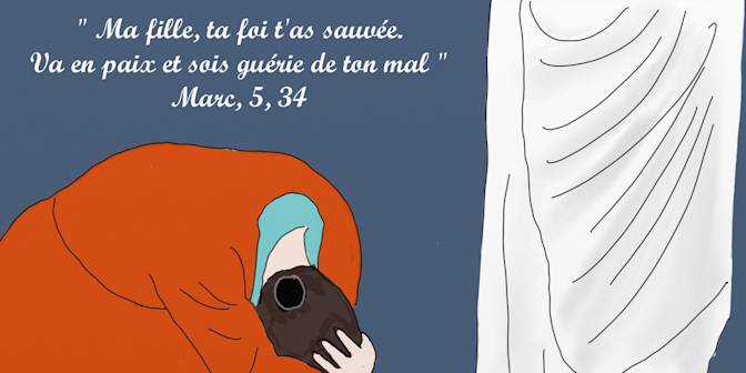 En ce temps-là, Jésus regagna en barque l’autre rive, et une grande foule s’assembla autour de lui. Il était au bord de la mer. Arrive un des chefs de synagogue, nommé Jaïre. Voyant Jésus, il tombe à ses pieds et le supplie instamment : « Ma fille, encore si jeune, est à la dernière extrémité. Viens lui imposer les mains pour qu’elle soit sauvée et qu’elle vive. » Jésus partit avec lui, et la foule qui le suivait était si nombreuse qu’elle l’écrasait. Or, une femme, qui avait des pertes de sang depuis douze ans… – elle avait beaucoup souffert du traitement de nombreux médecins, et elle avait dépensé tous ses biens sans avoir la moindre amélioration ; au contraire, son état avait plutôt empiré – … cette femme donc, ayant appris ce qu’on disait de Jésus, vint par-derrière dans la foule et toucha son vêtement. Elle se disait en effet : « Si je parviens à toucher seulement son vêtement, je serai sauvée. » À l’instant, l’hémorragie s’arrêta, et elle ressentit dans son corps qu’elle était guérie de son mal. Aussitôt Jésus se rendit compte qu’une force était sortie de lui. Il se retourna dans la foule, et il demandait : « Qui a touché mes vêtements ? » Ses disciples lui répondirent : « Tu vois bien la foule qui t’écrase, et tu demandes : “Qui m’a touché ?” » Mais lui regardait tout autour pour voir celle qui avait fait cela. Alors la femme, saisie de crainte et toute tremblante, sachant ce qui lui était arrivé, vint se jeter à ses pieds et lui dit toute la vérité. Jésus lui dit alors : « Ma fille, ta foi t’a sauvée. Va en paix et sois guérie de ton mal. » Comme il parlait encore, des gens arrivent de la maison de Jaïre, le chef de synagogue, pour dire à celui-ci : « Ta fille vient de mourir. À quoi bon déranger encore le Maître ? » Jésus, surprenant ces mots, dit au chef de synagogue : « Ne crains pas, crois seulement. » Il ne laissa personne l’accompagner, sauf Pierre, Jacques, et Jean, le frère de Jacques. Ils arrivent à la maison du chef de synagogue. Jésus voit l’agitation, et des gens qui pleurent et poussent de grands cris. Il entre et leur dit : « Pourquoi cette agitation et ces pleurs ? L’enfant n’est pas morte : elle dort. » Mais on se moquait de lui. Alors il met tout le monde dehors, prend avec lui le père et la mère de l’enfant, et ceux qui étaient avec lui ; puis il pénètre là où reposait l’enfant. Il saisit la main de l’enfant, et lui dit : « Talitha koum », ce qui signifie : « Jeune fille, je te le dis, lève-toi! » Aussitôt la jeune fille se leva et se mit à marcher – elle avait en effet douze ans. Ils furent frappés d’une grande stupeur. Et Jésus leur ordonna fermement de ne le faire savoir à personne ; puis il leur dit de la faire manger.