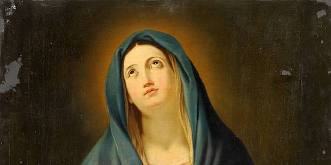 Deux larmes coulent comme des perles des yeux rieurs de Marie vers sa bouche qui sourit. Le visage tourné vers le ciel et les bras levés – dans l’attitude que, tant de fois, son fils Jésus prendra plus tard –, elle s’exclame : « Mon âme magnifie le Seigneur » et poursuit son cantique tel qu’il nous a été transmis. A la fin, au verset : “ Il relève Israël son serviteur ”, etc., elle joint les mains sur son cœur et s’agenouille, prosternée à terre, en adorant Dieu.