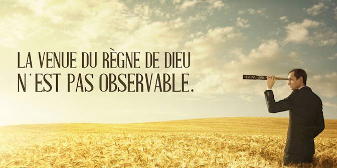 En ce temps-là, comme les pharisiens demandaient à Jésus quand viendrait le règne de Dieu, il prit la parole et dit : « La venue du règne de Dieu n’est pas observable. On ne dira pas : “Voilà, il est ici !” ou bien : “Il est là !” En effet, voici que le règne de Dieu est au milieu de vous. » Puis il dit aux disciples : « Des jours viendront où vous désirerez voir un seul des jours du Fils de l’homme, et vous ne le verrez pas. On vous dira : “Voilà, il est là-bas !” ou bien : “Voici, il est ici !” N’y allez pas, n’y courez pas. En effet, comme l’éclair qui jaillit illumine l’horizon d’un bout à l’autre, ainsi le Fils de l’homme, quand son jour sera là. Mais auparavant, il faut qu’il souffre beaucoup et qu’il soit rejeté par cette génération. »