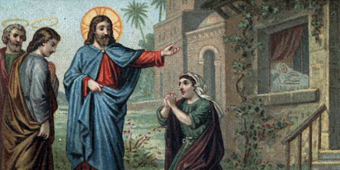 « Femme ! Ta foi est grande. Et par elle, tu consoles mon âme. Va donc, et qu’il te soit fait comme tu le désires. Dès ce moment, le démon est sorti de ta petite. Va en paix. Et comme, de chien perdu, tu as su vouloir être chien domestique, sache à l’avenir être fille, assise à la table du Père. Adieu.