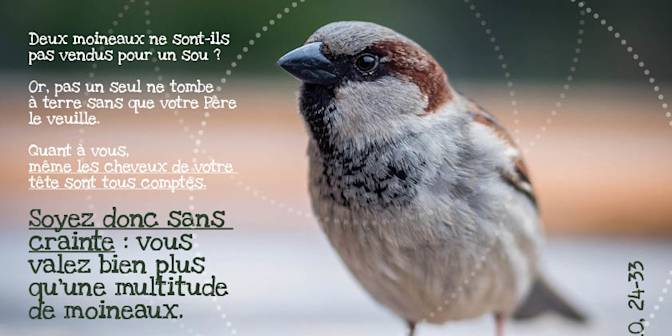 En ce temps-là, Jésus disait à ses Apôtres : « Le disciple n’est pas au-dessus de son maître, ni le serviteur au-dessus de son seigneur. Il suffit que le disciple soit comme son maître, et le serviteur, comme son seigneur. Si les gens ont traité de Béelzéboul le maître de maison, ce sera bien pire pour ceux de sa maison. Ne craignez donc pas ces gens-là ; rien n’est voilé qui ne sera dévoilé, rien n’est caché qui ne sera connu. Ce que je vous dis dans les ténèbres, dites-le en pleine lumière ; ce que vous entendez au creux de l’oreille, proclamez-le sur les toits. Ne craignez pas ceux qui tuent le corps sans pouvoir tuer l’âme ; craignez plutôt celui qui peut faire périr dans la géhenne l’âme aussi bien que le corps. Deux moineaux ne sont-ils pas vendus pour un sou ? Or, pas un seul ne tombe à terre sans que votre Père le veuille. Quant à vous, même les cheveux de votre tête sont tous comptés. Soyez donc sans crainte : vous valez bien plus qu’une multitude de moineaux. Quiconque se déclarera pour moi devant les hommes, moi aussi je me déclarerai pour lui devant mon Père qui est aux cieux. Mais celui qui me reniera devant les hommes, moi aussi je le renierai devant mon Père qui est aux cieux. »