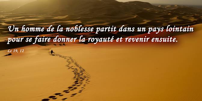 En ce temps-là, comme on l’écoutait, Jésus ajouta une parabole : il était près de Jérusalem et ses auditeurs pensaient que le royaume de Dieu allait se manifester à l’instant même. Voici donc ce qu’il dit : « Un homme de la noblesse partit dans un pays lointain pour se faire donner la royauté et revenir ensuite. Il appela dix de ses serviteurs, et remit à chacun une somme de la valeur d’une mine ; puis il leur dit : “Pendant mon voyage, faites de bonnes affaires.” Mais ses concitoyens le détestaient, et ils envoyèrent derrière lui une délégation chargée de dire : “Nous ne voulons pas que cet homme règne sur nous.” Quand il fut de retour après avoir reçu la royauté, il fit convoquer les serviteurs auxquels il avait remis l’argent, afin de savoir ce que leurs affaires avaient rapporté. Le premier se présenta et dit : “Seigneur, la somme que tu m’avais remise a été multipliée par dix.” Le roi lui déclara : “Très bien, bon serviteur ! Puisque tu as été fidèle en si peu de chose, reçois l’autorité sur dix villes.” Le second vint dire : “La somme que tu m’avais remise, Seigneur, a été multipliée par cinq.” À celui-là encore, le roi dit : “Toi, de même, sois à la tête de cinq villes.” Le dernier vint dire : “Seigneur, voici la somme que tu m’avais remise ; je l’ai gardée enveloppée dans un linge. En effet, j’avais peur de toi, car tu es un homme exigeant, tu retires ce que tu n’as pas mis en dépôt, tu moissonnes ce que tu n’as pas semé.” Le roi lui déclara : “Je vais te juger sur tes paroles, serviteur mauvais : tu savais que je suis un homme exigeant, que je retire ce que je n’ai pas mis en dépôt, que je moissonne ce que je n’ai pas semé ; alors pourquoi n’as-tu pas mis mon argent à la banque ? À mon arrivée, je l’aurais repris avec les intérêts.” Et le roi dit à ceux qui étaient là : “Retirez-lui cette somme et donnez-la à celui qui a dix fois plus.” On lui dit : “Seigneur, il a dix fois plus ! – Je vous le déclare : on donnera à celui qui a ; mais celui qui n’a rien se verra enlever même ce qu’il a. Quant à mes ennemis, ceux qui n’ont pas voulu que je règne sur eux, amenez-les ici et égorgez-les devant moi.” » Après avoir ainsi parlé, Jésus partit en avant pour monter à Jérusalem.