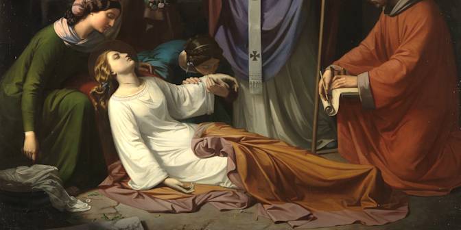 Une vierge regrette qu’elle renonce à la virginité. Cécile lui répond pour répondre à tous : « Tu fais erreur, Balbina. Je ne renonce à aucune virginité. J’ai consacré à Dieu mon corps et mon cœur, et je lui reste fidèle. J’aime Dieu plus que mes parents. Toutefois, je les aime encore au point de ne pas vouloir les amener à la mort avant que Dieu ne les rappelle à lui. J’aime Jésus, mon Epoux éternel, plus que tout homme. Mais j’aime les hommes au point de recourir à ce moyen pour ne pas perdre l’âme de Valérien. Il m’aime, et moi je l’aime chastement, je l’aime parfaitement, au point de vouloir qu’il m’accompagne dans la Lumière et la Vérité. Je ne crains pas ses colères. J’espère dans le Seigneur pour vaincre. J’espère en Jésus pour amener mon époux terrestre au christianisme. Si toutefois je n’obtiens pas la victoire et s’il me faut subir le martyre, je remporterai plus vite ma couronne. Mais non !… Je vois trois couronnes descendre du ciel: deux semblables, et une autre faite de trois sortes de pierres précieuses. Les deux semblables sont entièrement d’un rouge rubis. La troisième se compose de deux bandes de rubis tout autour, et d’un grand cordon de perles très pures. Elles nous attendent. Ne craignez rien pour moi. La puissance du Seigneur me défendra. Nous nous retrouverons bientôt réunis dans cette église pour saluer de nouveaux frères. Adieu. En Dieu. » [...]