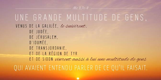 En ce temps-là, Jésus se retira avec ses disciples près de la mer, et une grande multitude de gens, venus de la Galilée, le suivirent. De Judée, de Jérusalem, d’Idumée, de Transjordanie, et de la région de Tyr et de Sidon vinrent aussi à lui une multitude de gens qui avaient entendu parler de ce qu’il faisait. Il dit à ses disciples de tenir une barque à sa disposition pour que la foule ne l’écrase pas. Car il avait fait beaucoup de guérisons, si bien que tous ceux qui souffraient de quelque mal se précipitaient sur lui pour le toucher. Et lorsque les esprits impurs le voyaient, ils se jetaient à ses pieds et criaient : « Toi, tu es le Fils de Dieu ! » Mais il leur défendait vivement de le faire connaître.