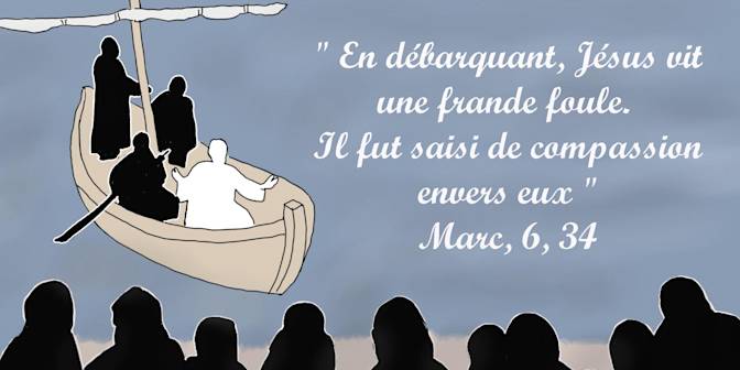 En ce temps-là, après leur première mission, les Apôtres se réunirent auprès de Jésus, et lui annoncèrent tout ce qu’ils avaient fait et enseigné. Il leur dit : « Venez à l’écart dans un endroit désert, et reposez-vous un peu. » De fait, ceux qui arrivaient et ceux qui partaient étaient nombreux, et l’on n’avait même pas le temps de manger. Alors, ils partirent en barque pour un endroit désert, à l’écart. Les gens les virent s’éloigner, et beaucoup comprirent leur intention. Alors, à pied, de toutes les villes, ils coururent là-bas et arrivèrent avant eux. En débarquant, Jésus vit une grande foule. Il fut saisi de compassion envers eux, parce qu’ils étaient comme des brebis sans berger. Alors, il se mit à les enseigner longuement.