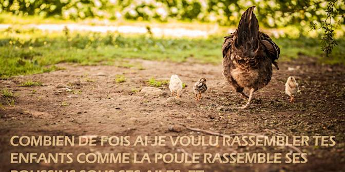 En ce jour-là, quelques pharisiens s’approchèrent de Jésus pour lui dire : « Pars, va-t’en d’ici : Hérode veut te tuer. » Il leur répliqua : « Allez dire à ce renard : voici que j’expulse les démons et je fais des guérisons aujourd’hui et demain, et, le troisième jour, j’arrive au terme. Mais il me faut continuer ma route aujourd’hui, demain et le jour suivant, car il ne convient pas qu’un prophète périsse en dehors de Jérusalem. Jérusalem, Jérusalem, toi qui tues les prophètes et qui lapides ceux qui te sont envoyés, combien de fois ai-je voulu rassembler tes enfants comme la poule rassemble ses poussins sous ses ailes, et vous n’avez pas voulu ! Voici que votre temple est abandonné à vous-mêmes. Je vous le déclare : vous ne me verrez plus jusqu’à ce que vienne le jour où vous direz : Béni soit celui qui vient au nom du Seigneur ! »