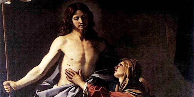 Le thème iconographique de l’apparition de Jésus ressuscité à sa mère apparaît dès l’art paléochrétien, et va se développer au fil du temps. Le tableau du Guerchin du XVIIe s., que nous présentons ci-dessus, nous offre une vision baroque, hautement expressive, de l’événement : dans la lignée de Caravage, le peintre italien Guercino (Le Guerchin) utilise en effet le procédé du clair-obscur, d’une grande puissance expressive. Ainsi, le Christ apparaît à sa mère dans la pleine lumière d’une chair brillante, transfigurée, et la Vierge Marie, prosternée à ses pieds, tend les bras vers lui jusqu’à le toucher, et nous montrer le côté droit ouvert du Christ, stigmates de sa Passion. Le Christ pose également son bras gauche sur l’épaule de sa mère, en un geste de tendresse filiale qui associe pleinement sa mère à la Résurrection. De sa main droite, il tient l’étendard de la victoire sur la mort, symbole utilisé traditionnellement pour représenter le Christ ressuscité. Tout le travail du mouvement des plis et des drapés, caractéristique du style baroque, confère à la scène une vie particulière, jouant sur les effets d’ombre et de lumière, de creux et de pleins dans les plis des vêtements, ainsi que sur l’opposition entre l’envol et ce qui pèse : ainsi, l’étendard déployé, flottant dans l’air, signifie cette victoire sur la mort, sur la pesanteur et sur l’immobilité.