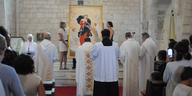 Environ 150 personnes se sont réunies le 11 septembre 2022 pour cette journée mariale. L’assemblée se composait de paroissiens, mais également de plusieurs membres de l’Association Marie de Nazareth qui a commandité une version modernisée du tableau de Marie qui défait les nœuds à Hélène Avot, artiste peintre.