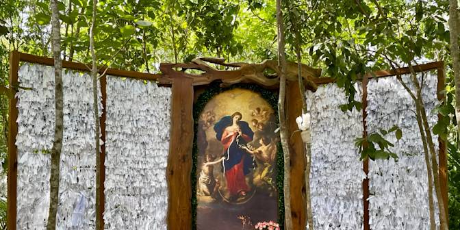 Des phrases gravées sur du bois vous accompagnent tout au long de votre visite, offrant des messages de foi et d’espérance. D'ailleurs, l'une des particularités de ce lieu est la tradition des rubans blancs : les visiteurs déposent leurs intentions de prière sur ces rubans qui sont ensuite suspendus dans les espaces naturels du sanctuaire, créant un tableau vivant de dévotion.