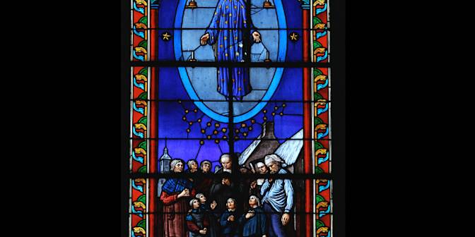 Sur le vitrail le père Barbedette se gratte le menton, il n’essaye plus de voir la Belle Dame de ses propres yeux mais il hésite encore : est-ce que tout cela est bien vrai ? Est-ce que je dois croire mes enfants et me mettre en prière comme le demande Monsieur le curé ? Est-ce que Dieu fait de tels signes ?