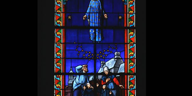 Ce mardi 17 janvier 1871, il est près de six heures du soir, Eugène (12 ans) sort de la grange où il travaille avec son père et son petit frère Joseph (10 ans) à piler des ajoncs. Il fait déjà nuit et soudain face à lui, dans le ciel, apparaît une Femme vêtue d’une robe bleue parsemée d’étoiles dorées avec sur la tête une couronne d’or. Elle est belle, elle lui tend les bras en souriant, alors il n’a pas peur. Quand le père Barbedette sort de la grange, il essaye d’apercevoir l’apparition. Regardez-le sur le vitrail qui illustre la neuvaine ce jour, il porte une vareuse bleue nouée sur le ventre et un bonnet blanc sur la tête. Le voilà qui utilise sa main comme une visière pour scruter le ciel mais il ne voit rien si ce n’est un triangle de grandes étoiles lumineuses. Le petit frère Joseph, lui, voit distinctement au centre du triangle la Belle Dame. Cela l’emplit de joie, le voilà qui s’exclame bruyamment : « Qu’elle est belle ! » Quand la mère Barbedette arrive, elle ne verra rien non plus, elle est agacée par l’exaltation de Joseph, on remarque que de sa main gauche, elle s’apprête même à lui donner une tape sur le bras. Mais que se passe-t-il ? Nos enfants ne sont pourtant pas des petits menteurs. « Allons chercher la sœur Vitaline, l’institutrice. Les sœurs sont meilleures que vous. Si vous voyez quelque chose, elle le verra bien aussi. »