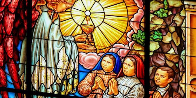 Ensuite, l'ange se relève, saisit le calice et l'hostie, fractionne celle-ci en trois et communie chacun des enfants en disant : « Prenenz et buvez le Corps et le Sang de Jésus-Christ horriblement outragés par les hommes ingrats. Réparez leurs crimes et consolez votre Dieu. »