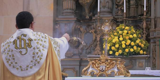 Au début de la cérémonie, le curé monte à l'autel afin de prendre à l'intérieur du tabernacle l'ostensoir contenant une grande hostie consacrée. A peine a-t-il ouvert sa porte qu'il s'arrête net, incapable de bouger et de prononcer un mot. La grande est devenue « transparente », « d'une telle diversité de nuances » qu'il croit d'abord à une détérioration.