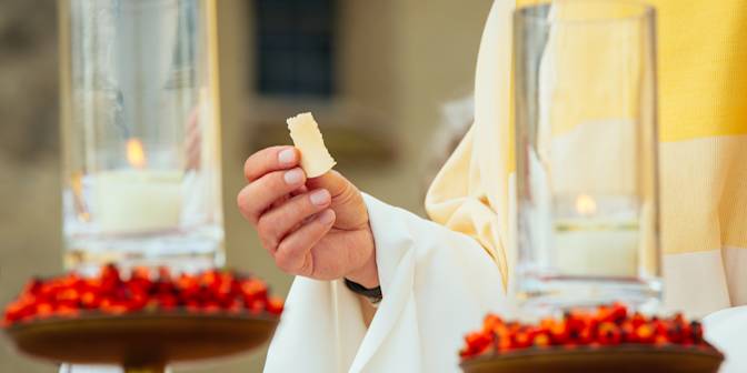Comme c’est la coutume à cette époque, il distribue la communion accompagné de deux fidèles portant une pièce de tissu servant à empêcher qu’une hostie ne tombe par terre.